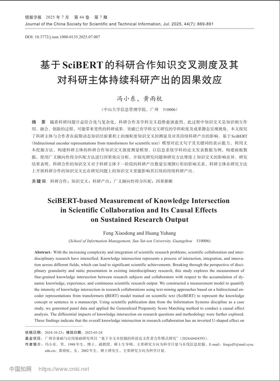 直播平台冯小东副教授、黄雨杭硕士研究生撰写的论文《基于SciBERT的科研合作知识交叉测度及其对科研主体持续科研产出的因果效应》发表于《情报学报》2025年第07期。