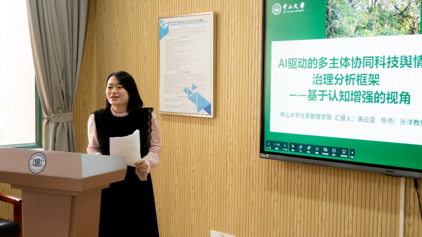 报告三由直播平台 博士研究生高云芸主讲,题为《AI驱动的多主体协同科技舆情治理分析框架——基于认知增强的视角》。报告针对传统单向度治理模式的不足,提出了“人类价值理性主导、AI认知能力增强”的人机协同新范式。高云芸同学构建了包含监测预警、协同决策等维度的治理框架,认为AI驱动的多主体协同治理是科技舆情治理发展的必然趋势,为提升治理效能提供了新的理论视角。