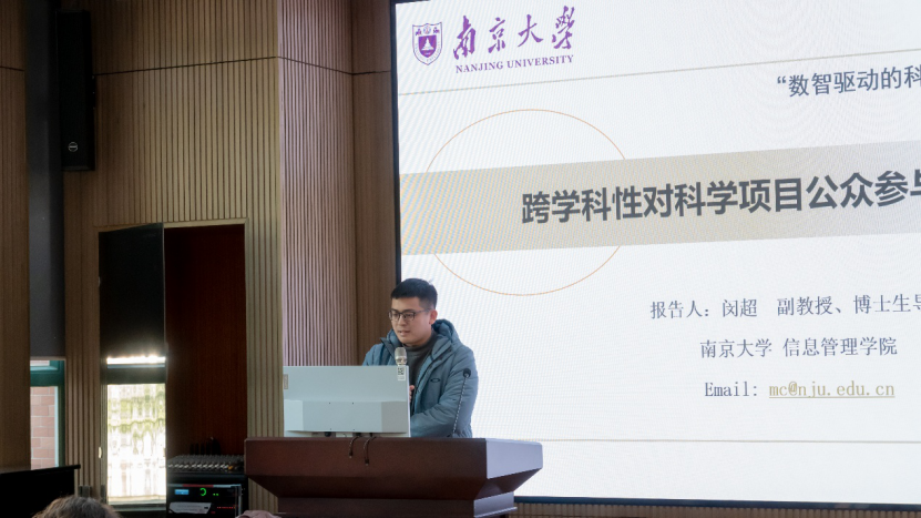 报告二由南京大学副教授闵超主讲,题为《跨学科性对科学项目公众参与意愿的影响》。闵超老师关注跨学科研究在知识重组与公众理解之间的张力。他通过构建理论框架,探讨了跨学科性、项目新颖性及研究团队身份三者如何共同作用于公众参与意愿。研究揭示,跨学科性不仅直接影响公众参与,还通过提升项目的新颖性发挥间接促进作用;同时,研究团队的身份特征在不同学科领域中发挥着差异化的调节效应。大连理工大学陈悦教授在点评中强调,该研究揭示了公众参与作为科学共同体与社会沟通桥梁的重要价值,对科技政策实施具有启示意义。