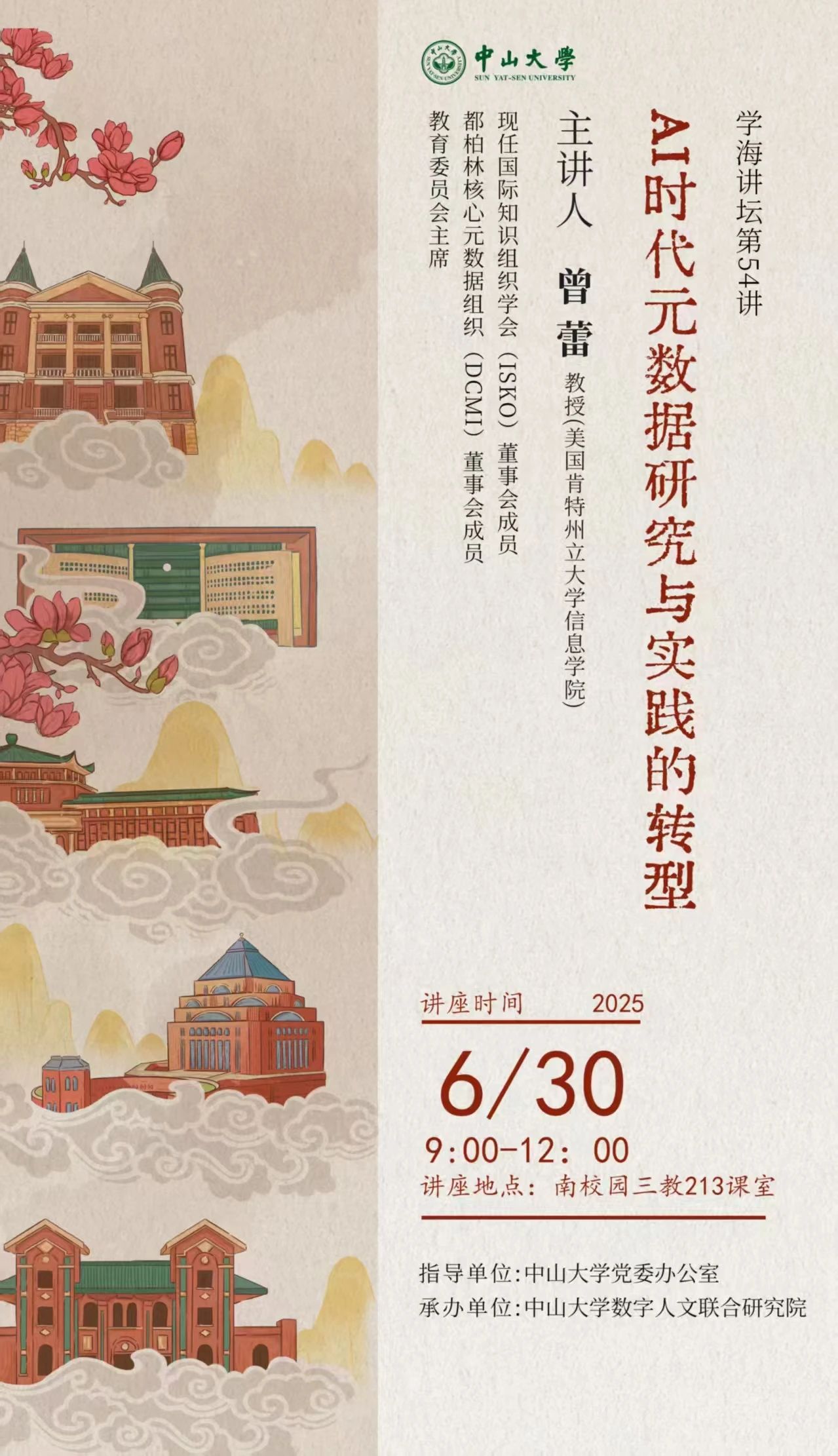 直播平台 学海讲坛第54讲“AI时代元数据研究与实践的转型”将由直播平台 数字人文联合研究院承办,由曾蕾教授(美国肯特州立大学信息学院)主讲。诚邀各位师友相聚学术盛宴!