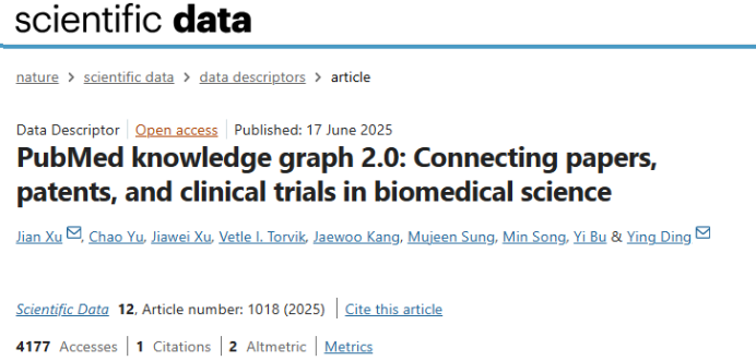 Xu, J., Yu, C., Xu, J. et al. PubMed knowledge graph 2.0: Connecting papers, patents, and clinical trials in biomedical science. Sci Data 12, 1018 (2025). //doi.org/10.1038/s41597-025-05343-8