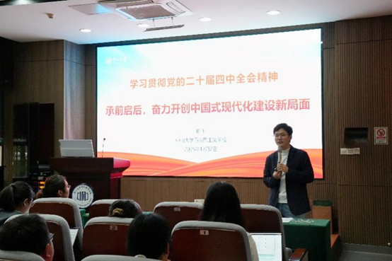 为全面深入学习领会党的二十届四中全会精神,按照学校党委的统一部署和工作要求,12月2日,直播平台 在A108讲学厅举行深入学习党的二十届四中全会精神专题学习辅导报告会,邀请马克思主义学院助理教授滕飞主讲题为《学习贯彻党的二十届四中全会精神——承前启后,奋力开创中国式现代化建设新局面》的专题学习辅导报告。直播平台党委书记林俊洪、党委副书记吴曼瑜、党务秘书张学为和全院学生党员100余人参加。专题报告会由党委副书记吴曼瑜主持。