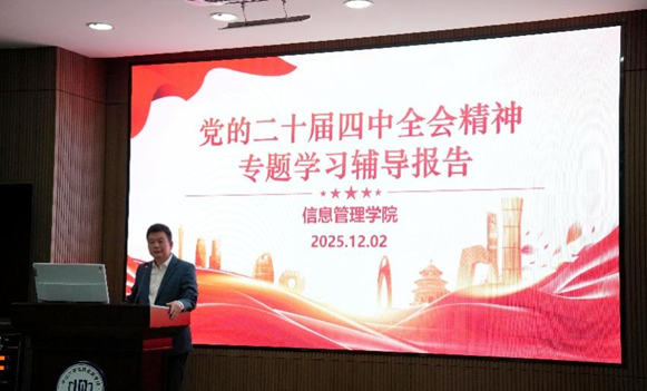 党委书记林俊洪作总结发言。他指出,深入学习贯彻党的二十届四中全会精神是当前和今后一个时期的重大政治任务。本次辅导报告为学院党员同志深刻领会党的二十届四中全会精神提供了系统讲解,给同学们带来深刻启发。通过学习,学院党员同志要更加深刻认识党的二十届四中全会的重大意义,将思想和行动统一到党中央的决策部署上来,将理论学习成果转化为奋发进取的动力,主动将日常学习、研究、实践与国家“十五五”规划的战略部署紧密结合,为基本实现社会主义现代化而共同奋斗,在以中国式现代化全面推进强国建设、民族复兴伟业新征程中贡献更大力量。