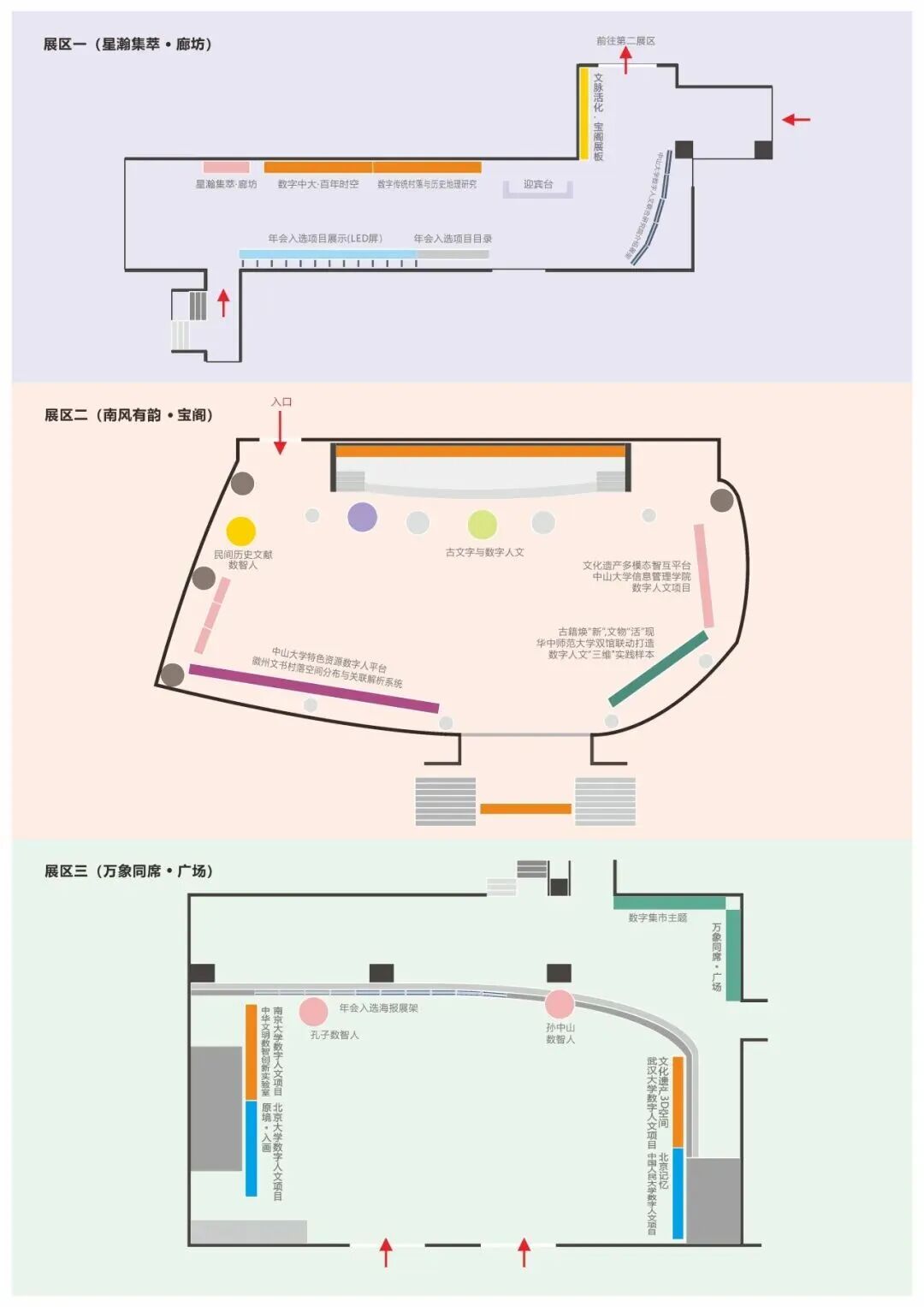 展区依内容特色划分为三个主题区域:“万象同席·广场”“星瀚集萃·廊坊”与“南风有韵·宝阁”。所展示的项目类型丰富多元,涵盖数据库、软件工具、数字平台、可视化作品、XR交互设计作品、大模型及智能体等多个研究方向,集中体现了数字人文的方法创新与学科活力。