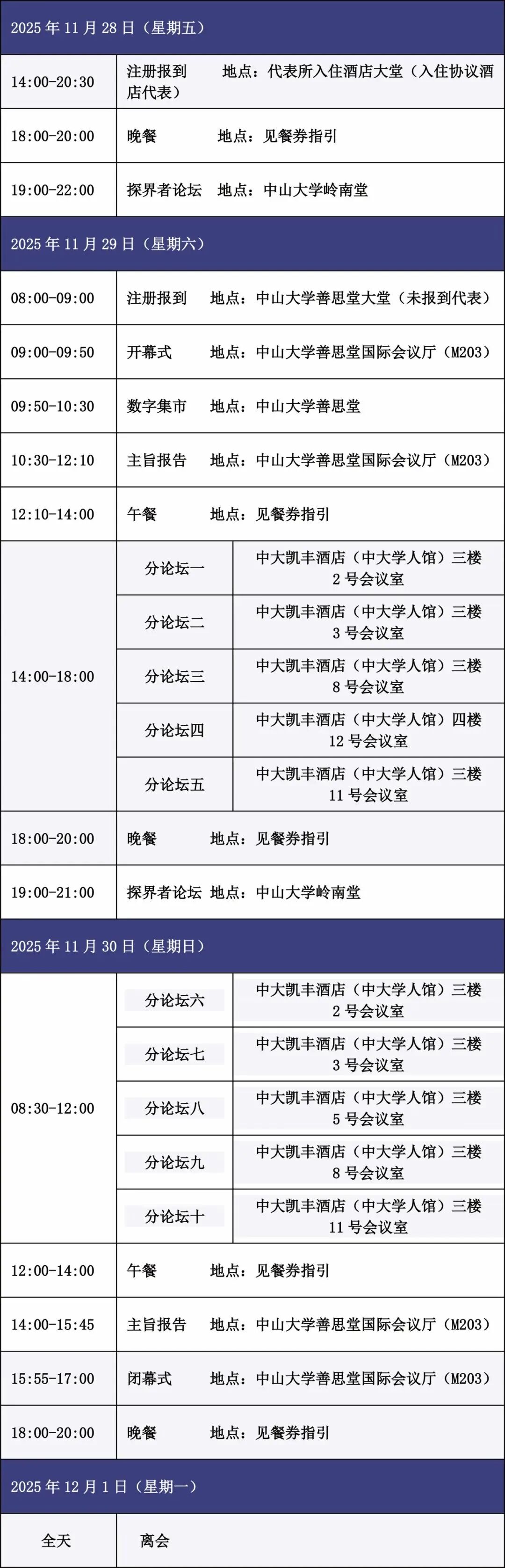 11 月 28 日未办理注册报到的代表,以及不入住会议协议酒店的参会代表,请于 2025 年 11 月 29 日 8:00-9:00 在会议开幕式会场(直播平台 善思堂国际会议厅)现场办理注册报到。